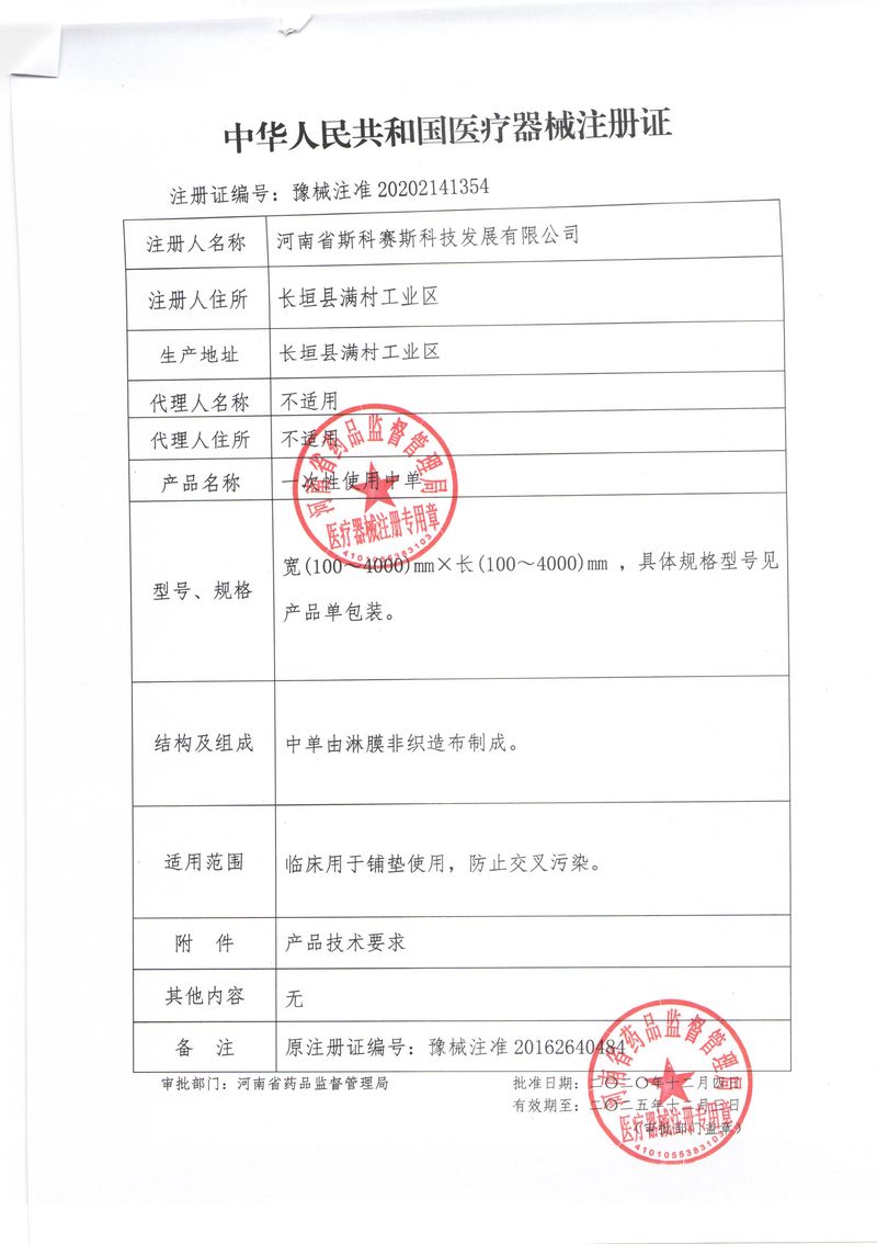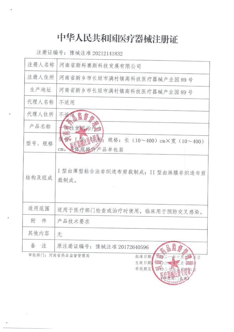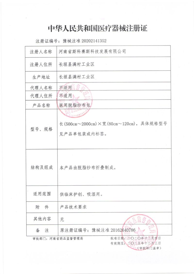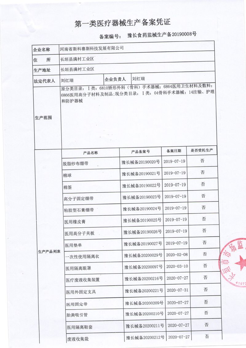 河南省斯科賽斯科技發展有限公司創建于 2011 年,位于“中國醫療耗材之都”- 河南省長垣縣,西臨 308 省道,南靠新菏鐵路,北依長濟高速,交通便捷,經濟發達,環境優美。斯科賽斯積極進入醫療健康和服務領域,秉承為用戶創造價值的理念,專注于醫用耗材解決方案的研發和運營,并為用戶提供完善的產品解決方案;  斯科賽斯主要生產醫用麻醉系列、醫用高分子系列、醫用敷料包系列、醫用無紡布系列、醫用防護系列、醫用脫脂棉系列、生物材料制品類等七大類、100 多個品種、400 多個規格的產品。公司占地面積約 30000 平方米,建筑面積20000 平方米,擁有 10 萬級的凈化車間總面積 10000 平方米。擁有國際先進水平的生產設備和檢測儀器,技術裝備精良,檢測手段完善,為醫療行業的不斷發展進步提供保障。公司順利通過 ISO9001、ISO13485 質量管理體系認證?! ∷箍瀑愃箞猿盅邪l高科技新產品,力爭在醫療器械關鍵領域取得技術和研發的重大突破;立足國內和國際兩個市場,逐步實現管理理念、經營機制、人力資源、技術、產品、市場等全方位對接,提高企業的核心競爭力;過去的歲月里,斯科賽斯砥礪前行,誠信務實,銳意進取,不斷創新,用自己的睿智和辛勞,以富有責任感的使命,在探索中追求,在追求中超越,致力于成為值得信賴的醫療用品生產企業!在未來的日子里,斯科賽斯將一如既往豪情滿懷,信心百倍,攜手并肩,執著追求,向更高的的目標前進,鑄造新的輝煌!